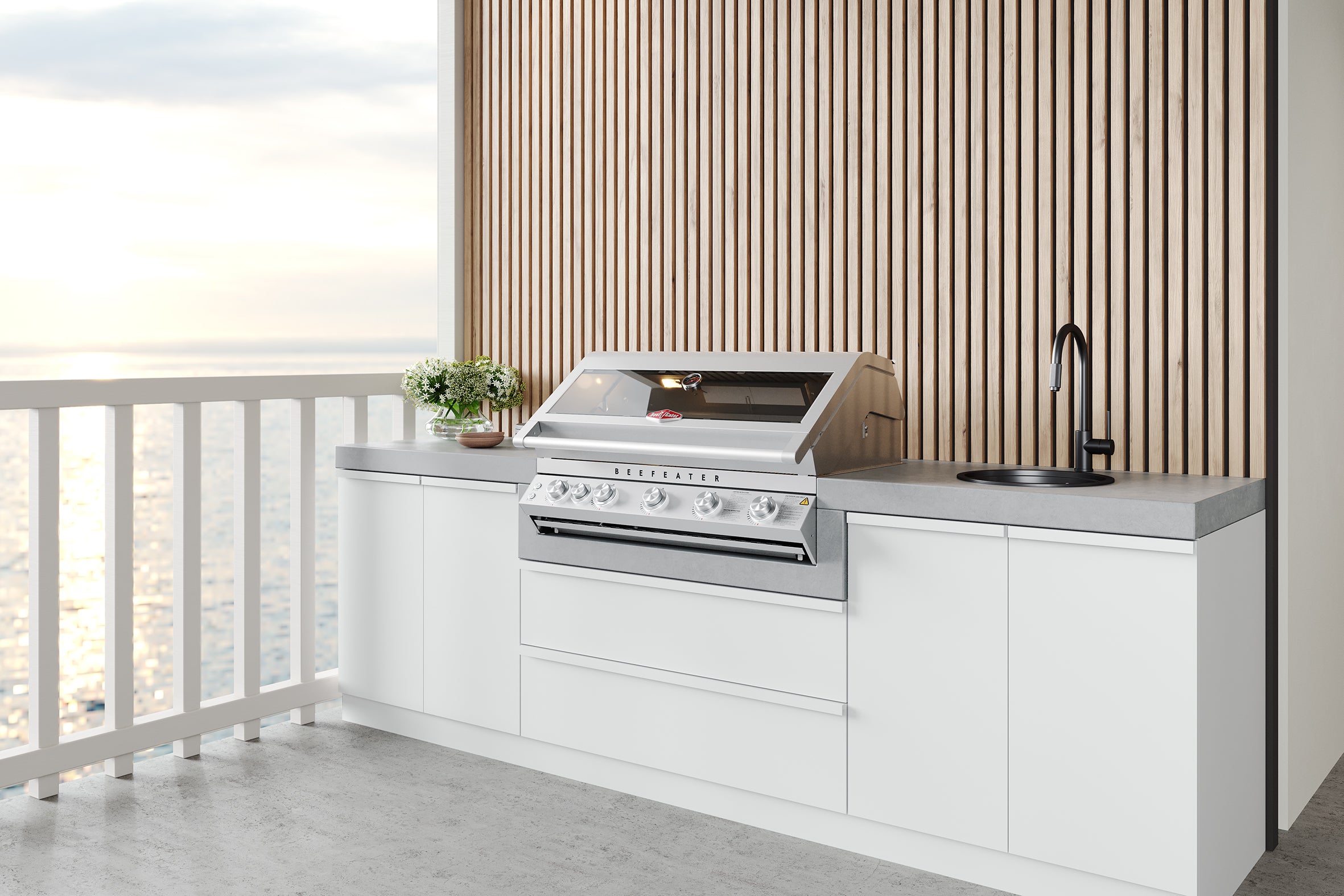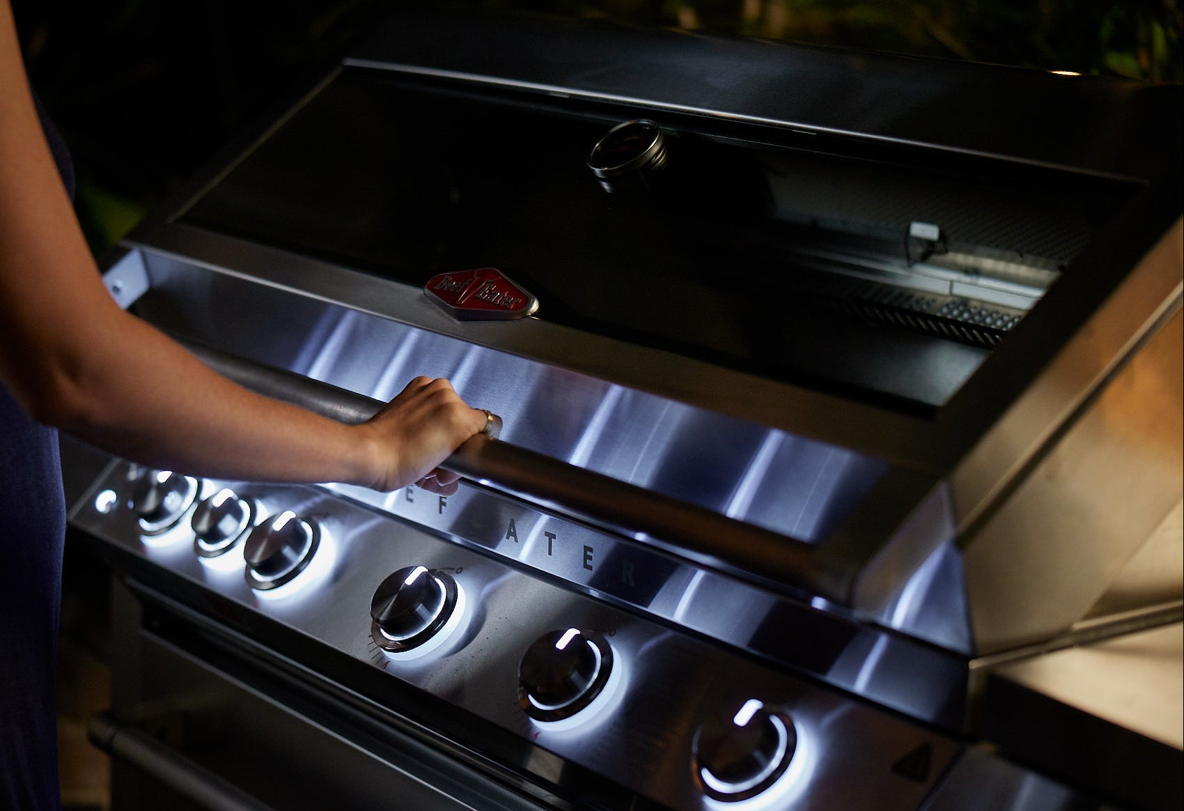 BeefEater's flagship BBQ is available in two options, Classic or Premium. The Premium model features a powerful 3.1kW rear rotisserie burner, durable laser etched details, cast iron grill and plates for superior heat retention, an integrated temperature gauge with a large glass window, a cast iron side burner with brass cap for even flames, a concealed ice box with chopping board for drinks and prep, accessory rails for organization, and LED-lit control dials for easy cooking day or night.